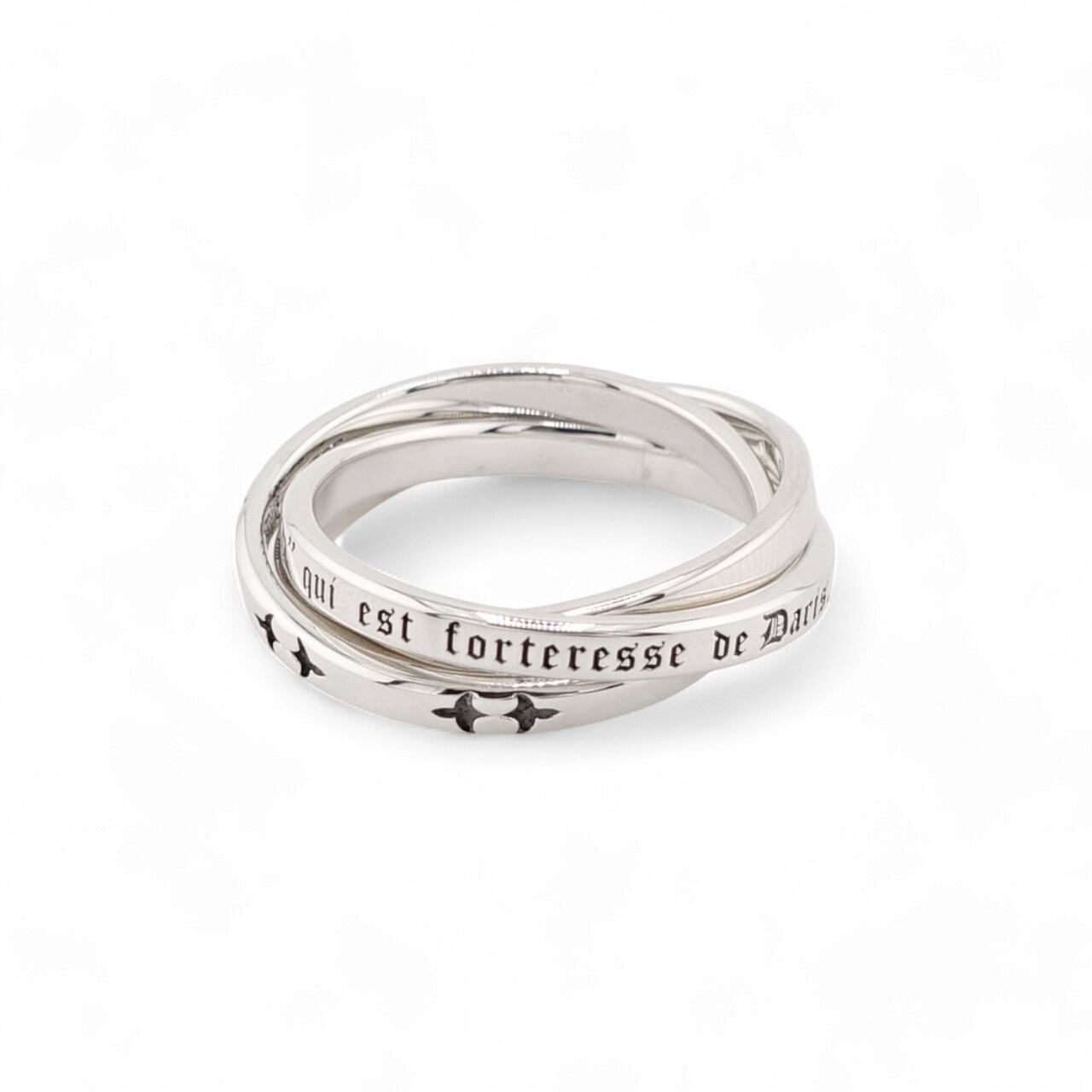 3本のリングが美しく交差し、ひとつの形を成す繊細なデザイン。